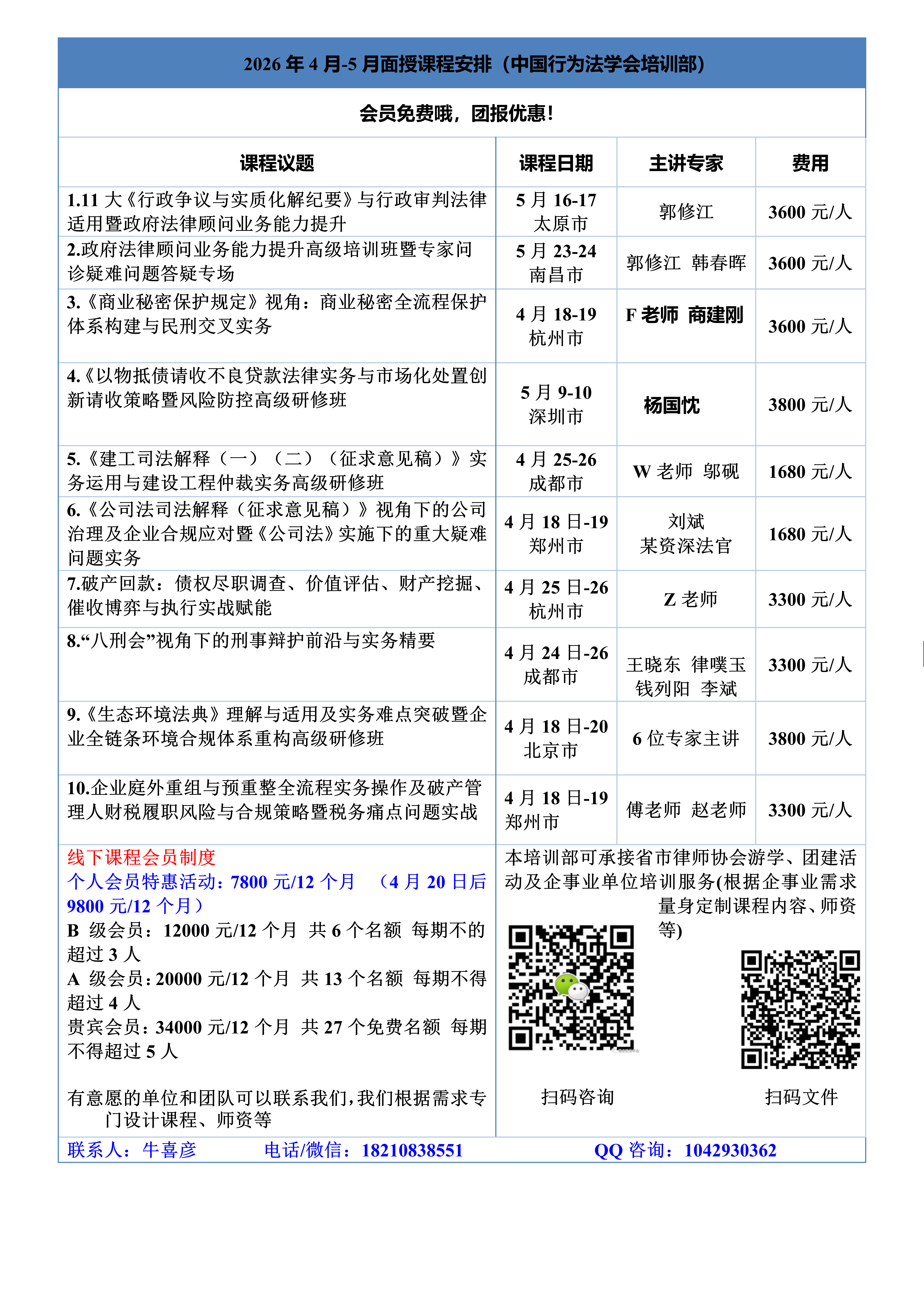 中国行为法学会培训部华睿律云5月份法律课程安排每天学法知法 2026年4月19日 22:38 北京 听全文办理会员 - 免费参加一【成都市】人大法工委成员解析《生态环境法典》理解与适用及实务难点突破主讲专家S老师,全国人大法工委;《生态环境法典》编纂工作专班成员。L老师,全国人大法工委;《生态环境法典》编纂工作专班成员......